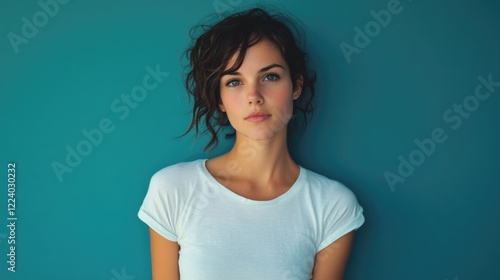 Fashionable young woman with curly hair wearing a white t-shirt against a teal background exuding confidence and style in a modern setting