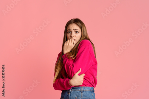 Fear concept. Frightened teenager girl covers her mouth with hand