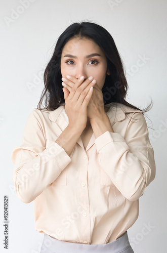 Fearful and speehless Asian woman covers her mouth, South Asian woman can not speak freely due to censorship, no free speech, no freedom of speech concept