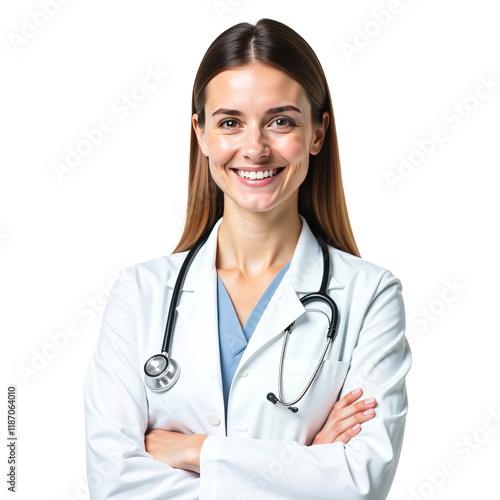 Female Doctor Stethoscope, Medical Professional Portrait, Doctor on White, Healthcare Expert Image, Friendly Doctor Isolated, High-Resolution Stock Photo