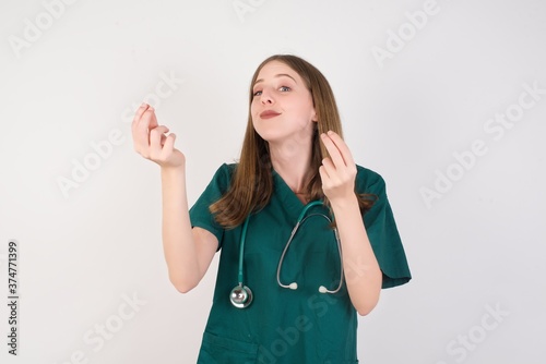 Female doctor wearing a green scrubs and stethoscope doing money gesture with hands, asking for salary payment, millionaire business
