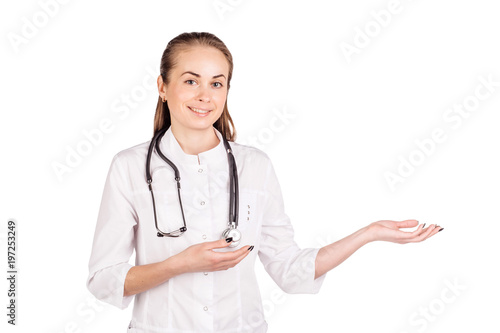Female doctor with stethoscope show something and smile to you isolated on white background.