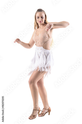 Female Latino skillful dancer moving arms smiling and looking down. Full body length portrait isolated on white studio background.