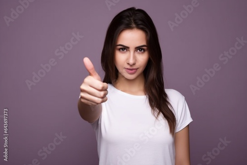 female model giving thumbs up sign with purple background