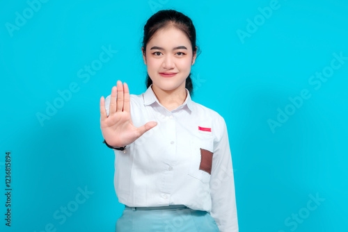 female student dressed in a uniform gesturing Stop with Hand on a Blue Background