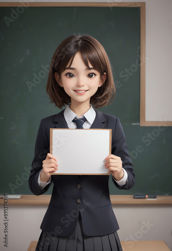 female student holding white blank sign copy space with classroom background