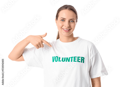 Female volunteer pointing at her t-shirt on white background