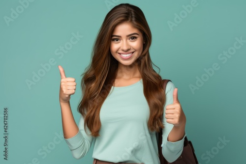 Fictional young woman thumb up. Isolated on plain blue background. Generative AI.