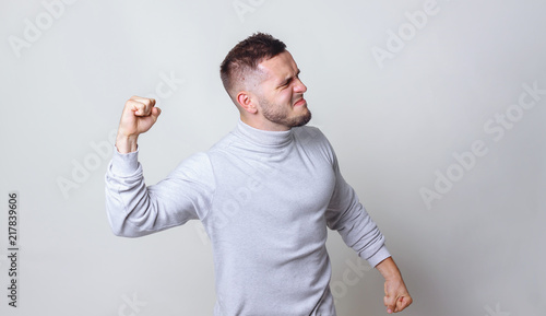 Fight concept side view. Portrait of man in threaten pose. Caucasian man raised fist in fight gesture on grey background copy space