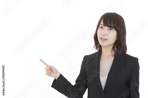 ビジネスウーマン 指し示す 白バック カメラ目線