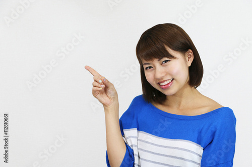 指を差す若い女性