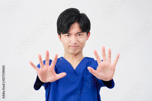 医者・看護師・歯科医師・介護士 男性 ストップのジェスチャー 白背景