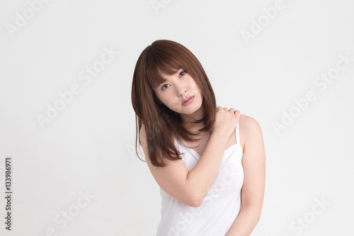 風邪をひいて、体調の悪い女性。つらそうな表情の女性です。