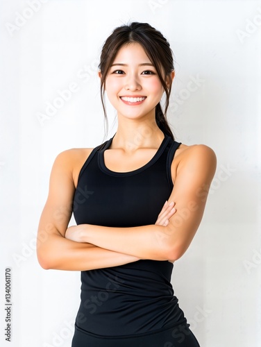 日本人 女性 美しい 筋肉 パーソナル トレーナー スマイル バストショット 黒 灰色 白 背景日本人 女性 美しい 筋肉 パーソナル トレーナー スマイル バストショット 黒 灰色 白 背景