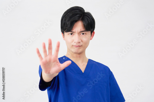 医者・看護師・歯科医師・介護士 男性 ストップのジェスチャー 白背景
