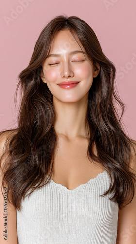 장난스럽게 윙크하는 한국 여성의 스튜디오 초상, 애교살 메이크업과 그라데이션 립
