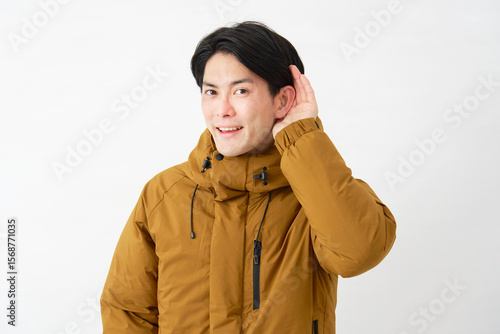 ダウンジャケットを着た男性 耳を澄ます 白背景