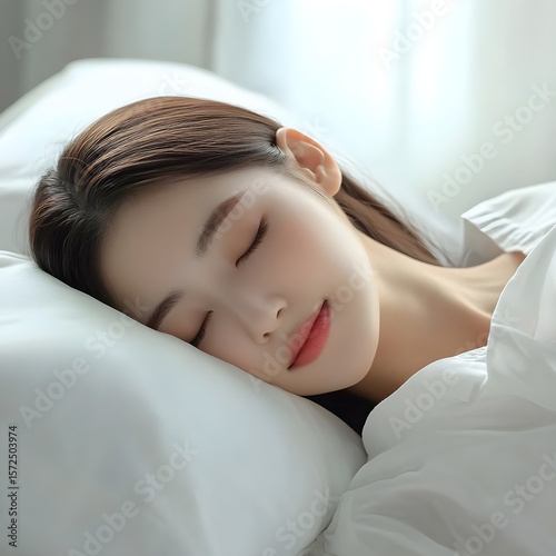 柔らかい白い寝具でぐっすりとベッドで眠る穏やかな若い女性。安らかな眠り。