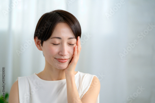 ノースリーブで明るい部屋にいる日本人女性のビューティーイメージ