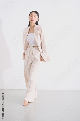白背景で撮影をしたジャケットを着た若い女性のスタイリッシュなポートレート