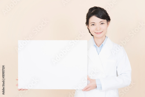 ホワイトボードを持つ白衣の女性