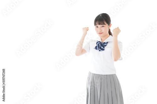 ガッツポーズをする笑顔の女子学生