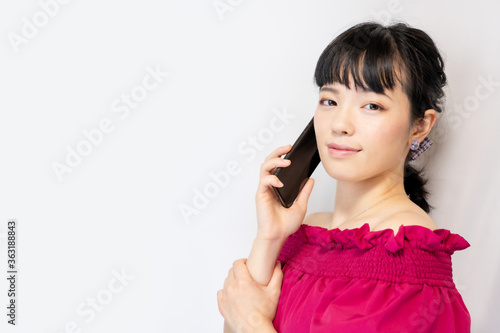スマホで通話する女性(白背景)