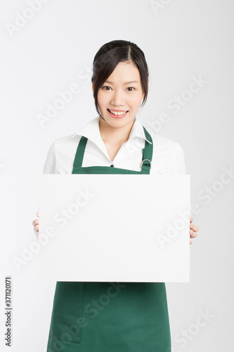 メッセージボードを持った女性店員