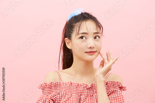 かわいい女の子のカジュアルなビューティーポートレート ( ピンク背景 )