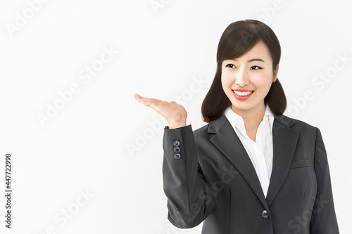 白背景で、お勧めポーズをするスーツ姿の若い女性