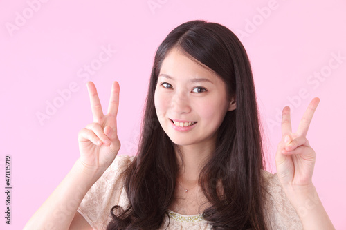 ピースサインをする若い女の子