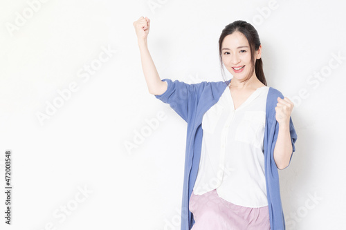 白い壁の前の椅子に座ってガッツポーズをする主婦