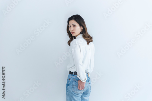 デニムと白シャツのクールな女性