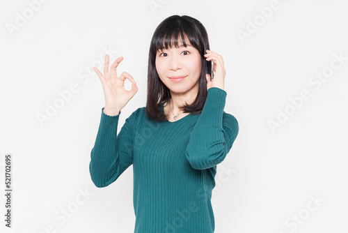 白背景の前で、スマホで会話をしている女性