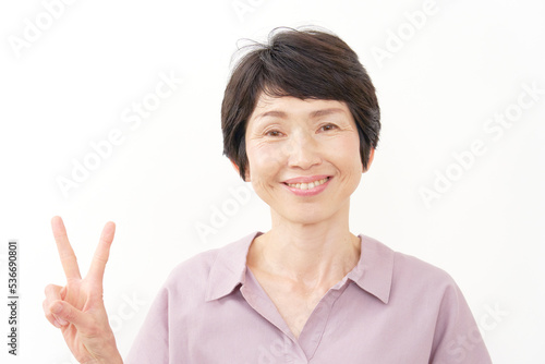 ピースサインするシニア女性 白背景