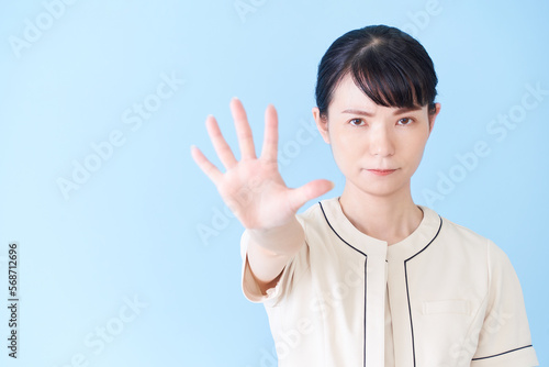 手を出して制止するエステ・美容クリニックの女性