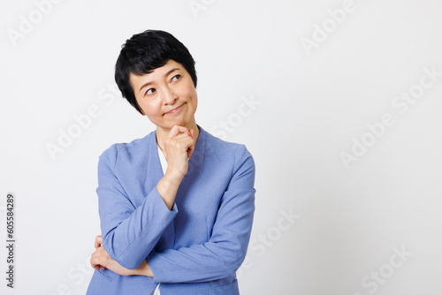 熟考する賢いカジュアルな服の成熟した日本人女性