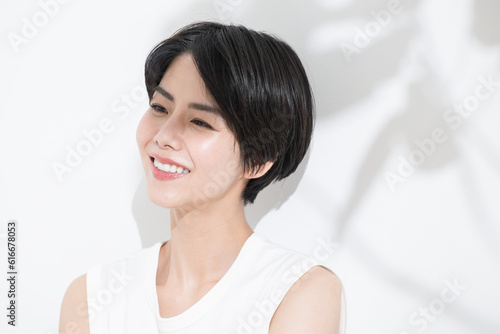 夏のイメージに使いやすい日焼けや紫外線のアジア系女性の顔のアップの美容イメージ 明るいコピースペースあり