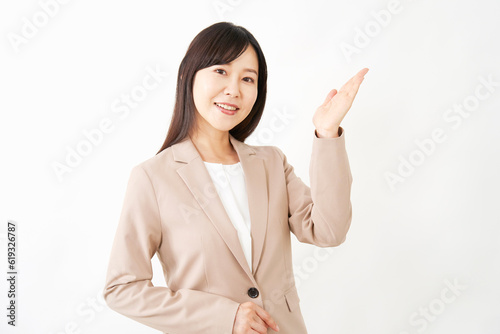 右側を手のひらで指すミドルエイジのビジネスウーマン 白背景