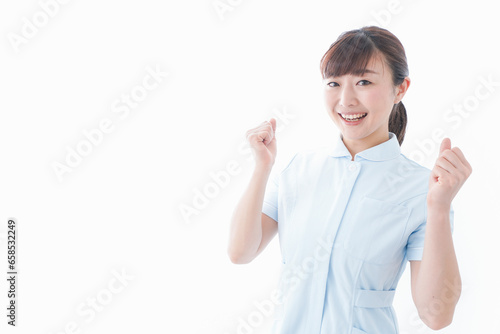 ガッツポーズをする若い看護師