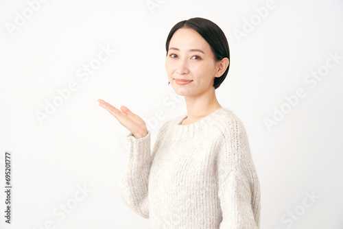 左側を掌で指す中年女性 白背景