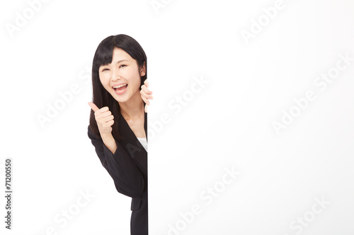 メッセージボードとグッドサインするビジネスウーマン