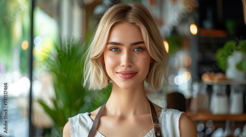 ブロンドヘアの若い欧米人 エプロン姿のスタッフ