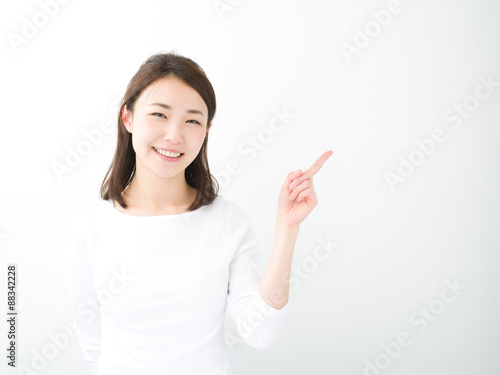指差す若い女性