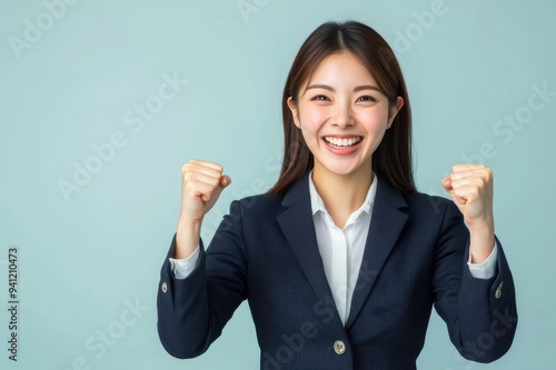 ガッツポーズをして喜ぶ日本人の女性会社員(プレゼン・成功・達成・合格・歓喜・嬉しい)