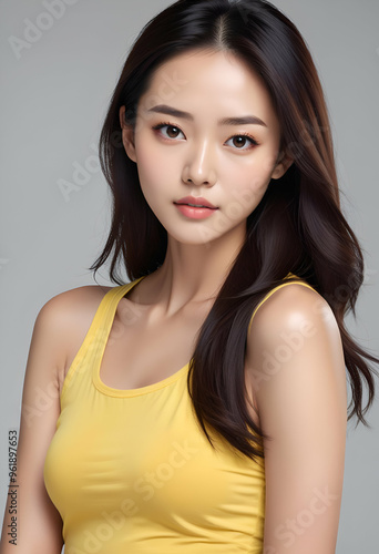 黄色のタンクトップの日本人女性モデル – 自然光ポートレート、モダンで洗練されたシンプルな美しさ