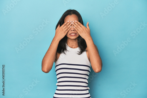 Filipina young woman on blue studio afraid covering eyes with hands.