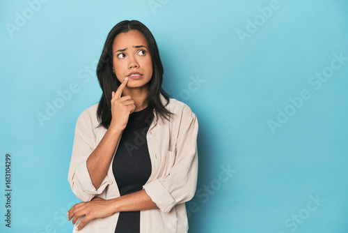 Filipina young woman on blue studio looking sideways with doubtful and skeptical expression.