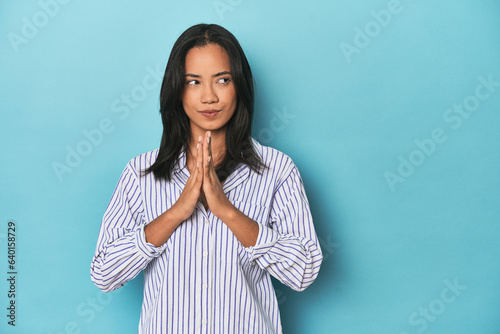 Filipina young woman on blue studio making up plan in mind, setting up an idea.