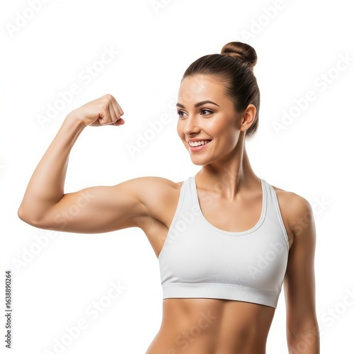 Fit woman flexing her biceps in sportswear isolated on white background, showcasing strength and fitness
